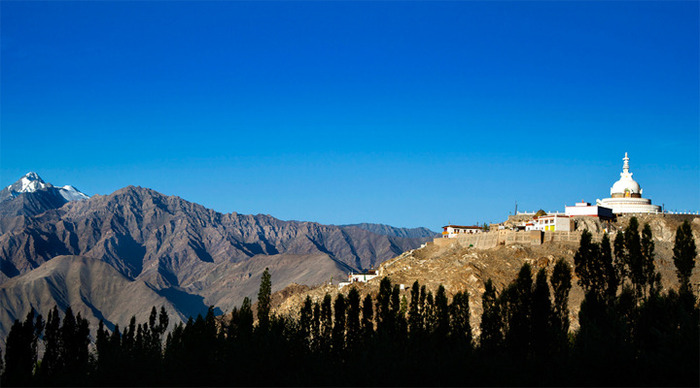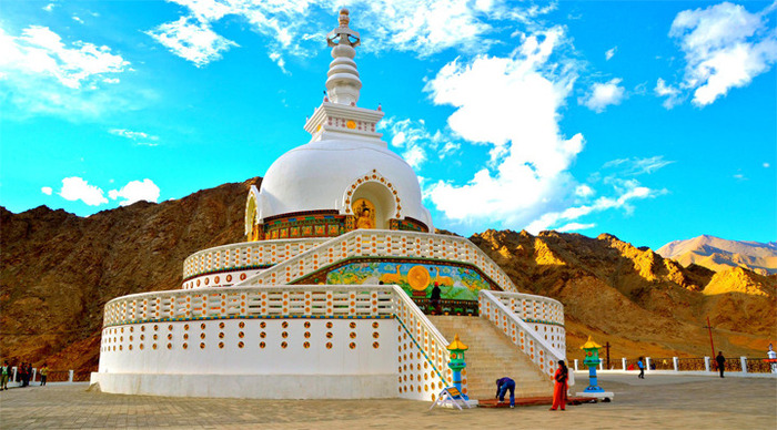 På eftermiddagen besök Shanti Stupa, invigd av Dalai Lama år 1985 – belägen på en kulle i Changspa och lättillgänglig från Fort Road.
