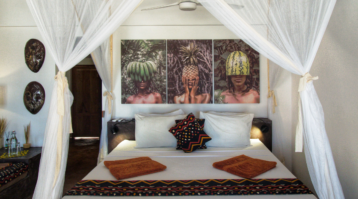 Varje hus på Mwezi Boutique Resort är unikt och exklusivt inrett – ingen är den andra lik. All inredning, från sängar och lampor till minsta detalj, är specialdesignad av ägarna i samarbete med det lokala samhället. Konstverken kommer från unga afrikanska konstnärer och skulptörer, vilket ger varje hus en personlig och genuin karaktär. Utsidan är putsad med miljövänliga och naturbaserade material som kalk och flodsand, vilket ger en levande yta som skiftar i färg beroende på ljuset. Garderoberna är byggda av återvunnet trä och galgarna tillverkade av återvunnen kartong.