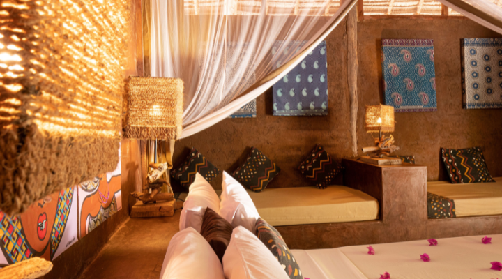 Resorten erbjuder boende i 7 Full Moon Houses, 5 Moon Houses, 3 Pool Houses och 2 Beach Houses – alla unikt inredda och utrustade med luftkonditionering. Till skillnad från Moon Houses har Full Moon Houses även ett vardagsrum med en stor inbyggd soffa samt ett mysigt loft. Dessutom har de en riktig terrass med utsikt rakt ut över havet. Beach House är ett litet strandhus med en privat trädgård som vetter direkt mot den vackra stranden i Jambiani. Pool Houses har utsikt över poolen och är utrustade med en king size-säng samt en soffa (maxlängd 180 cm) som kan rymma 1–2 extra personer.